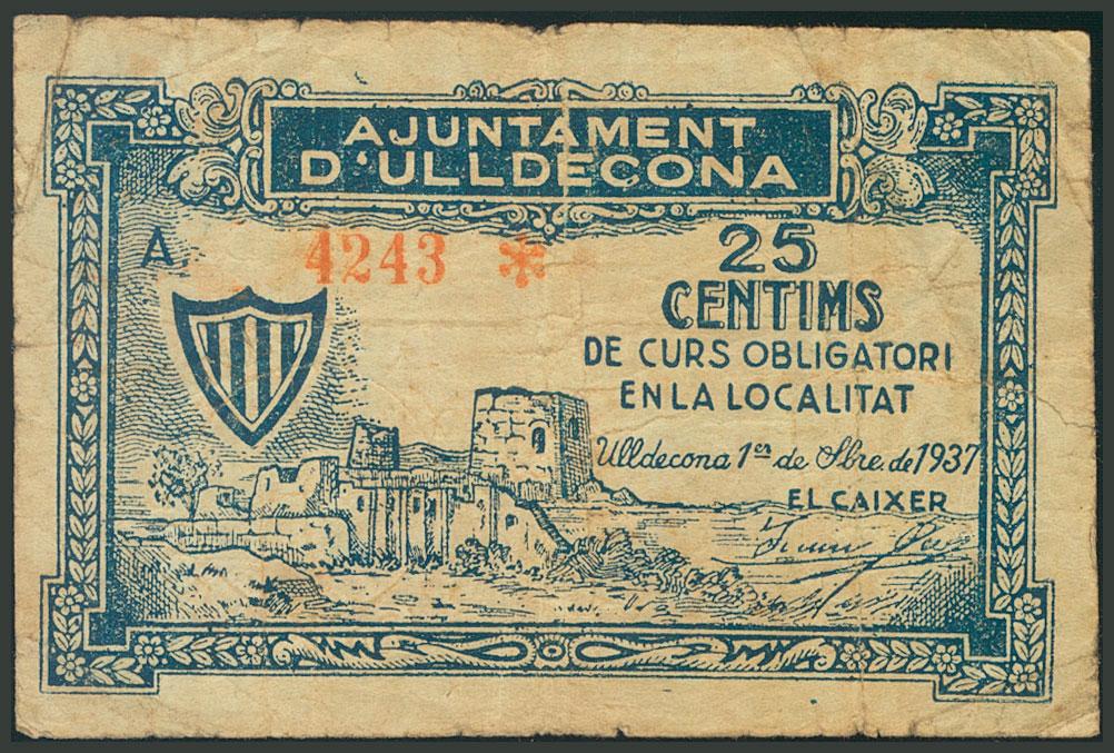 ULLDECONA (TARRAGONA). 25 Céntimos. 1 de Octubre de 1937. Serie A. (González: 10454). BC.