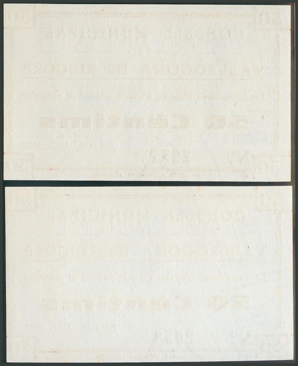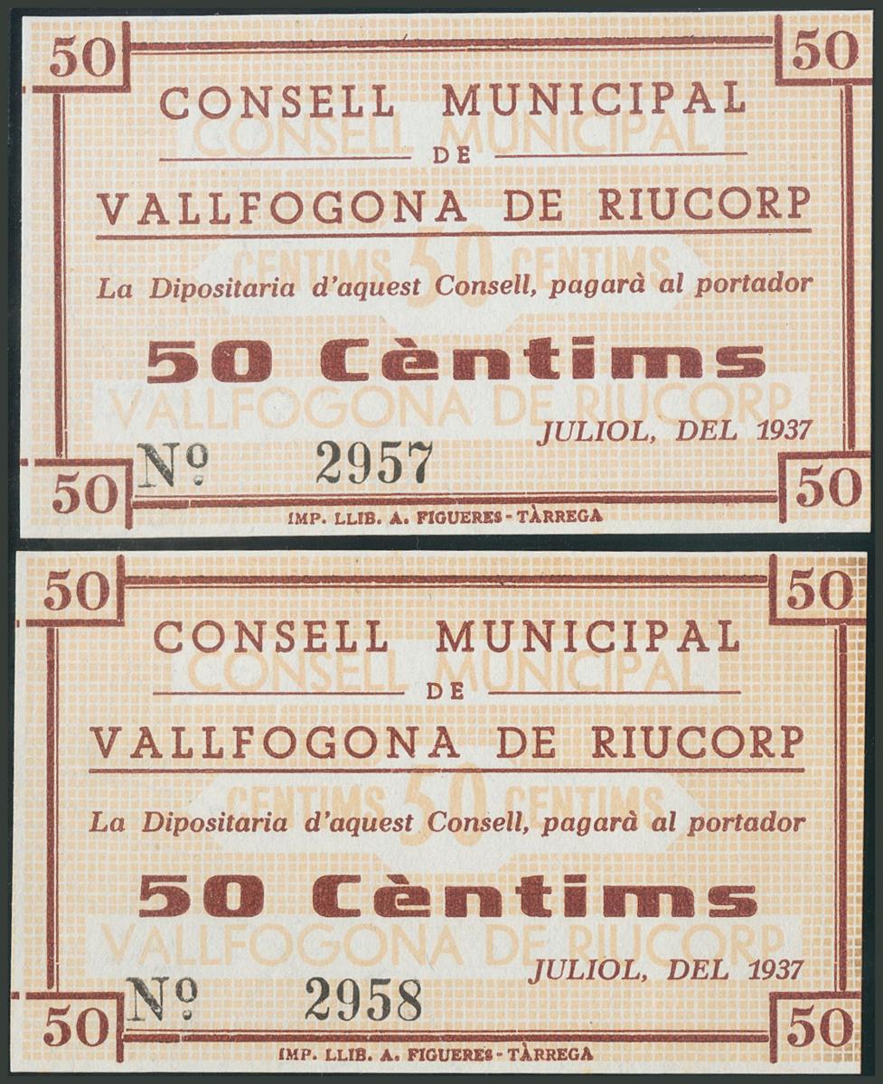 VALLFOGONA DE RIUCORP (TARRAGONA). 50 Céntimos. Pareja correlativa. Sin sello estampado en el reverso. (González: 10517). SC.