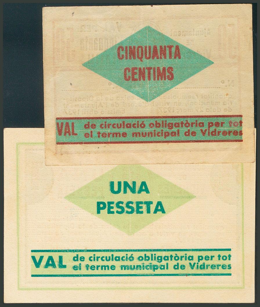 VIDRERES (GERONA). 50 Céntimos y 1 Peseta. Abril 1937. Serie B. (González: 10646/47). EBC.