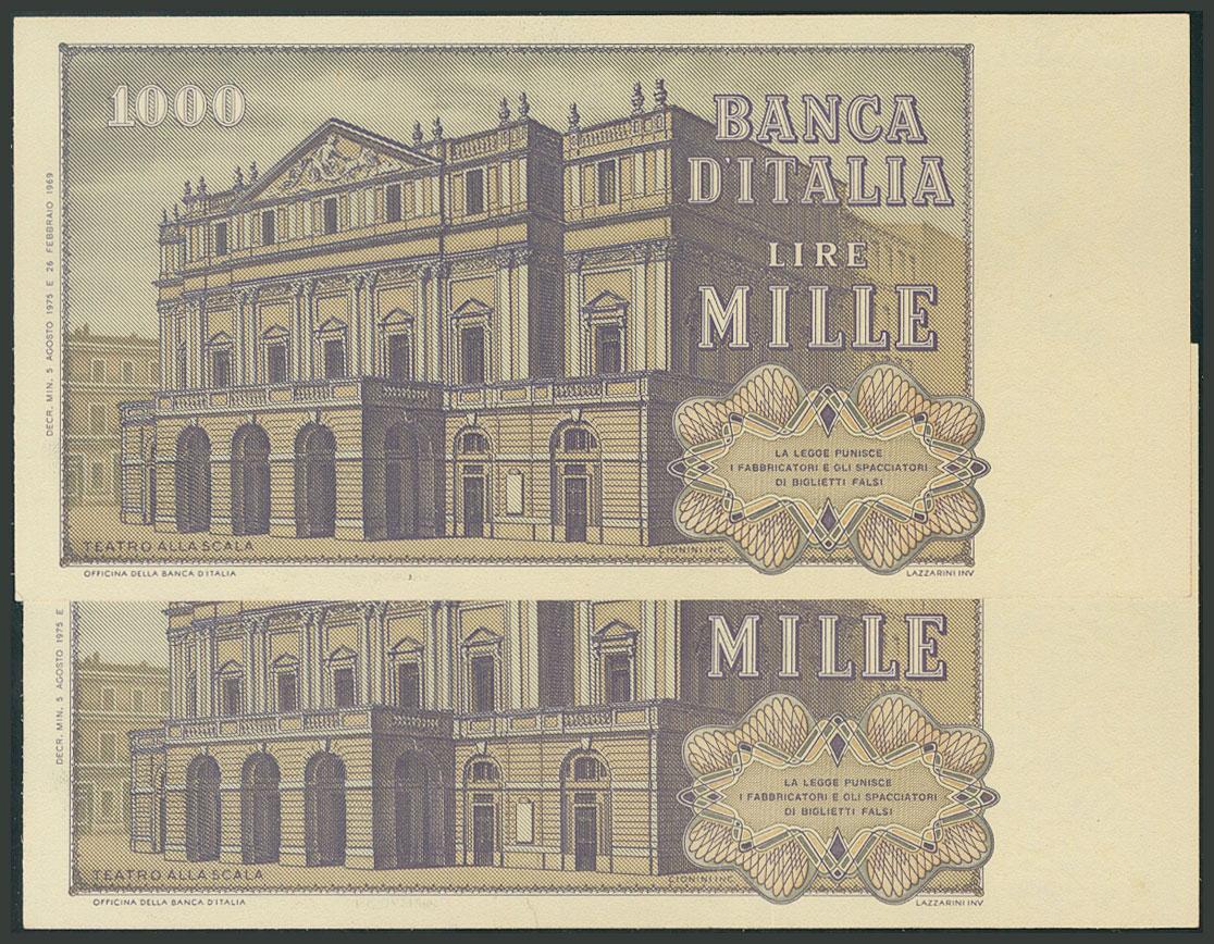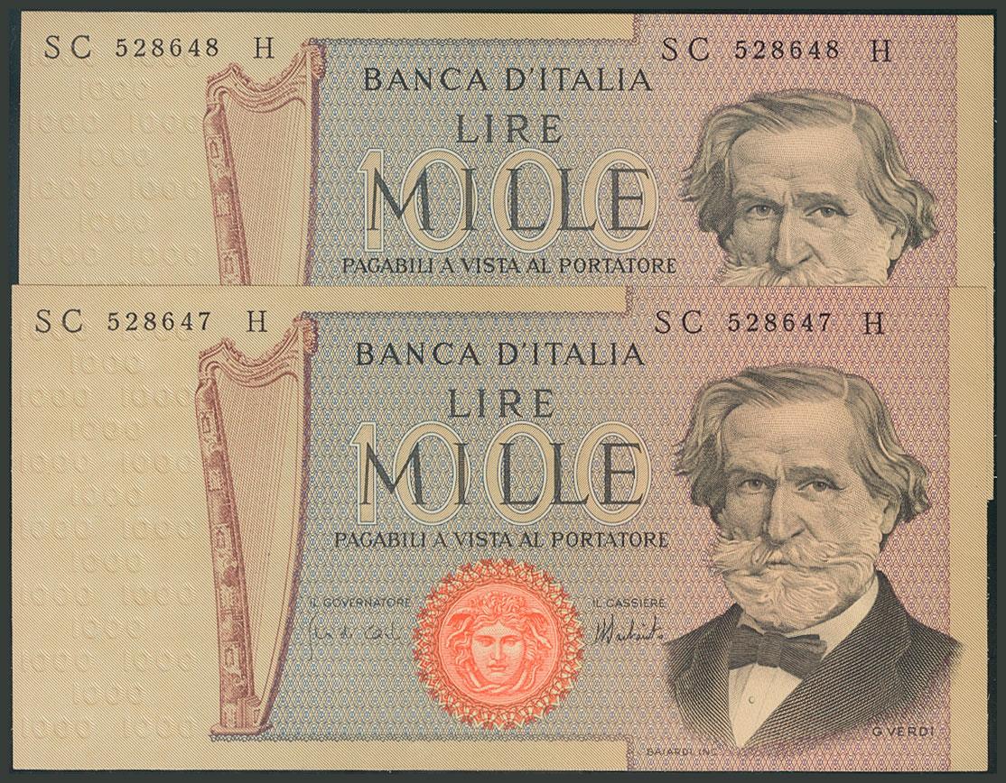 ITALIA. 1000 Lire. 5 de Agosto de 1975. Pareja correlativa. Serie SCH. Firmas Carli y Barbarito. (Pick: 101d). SC.