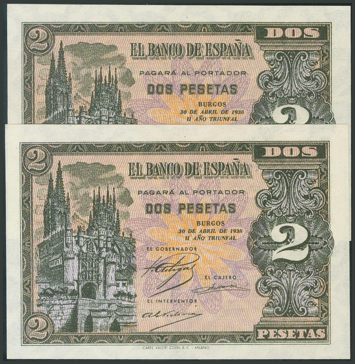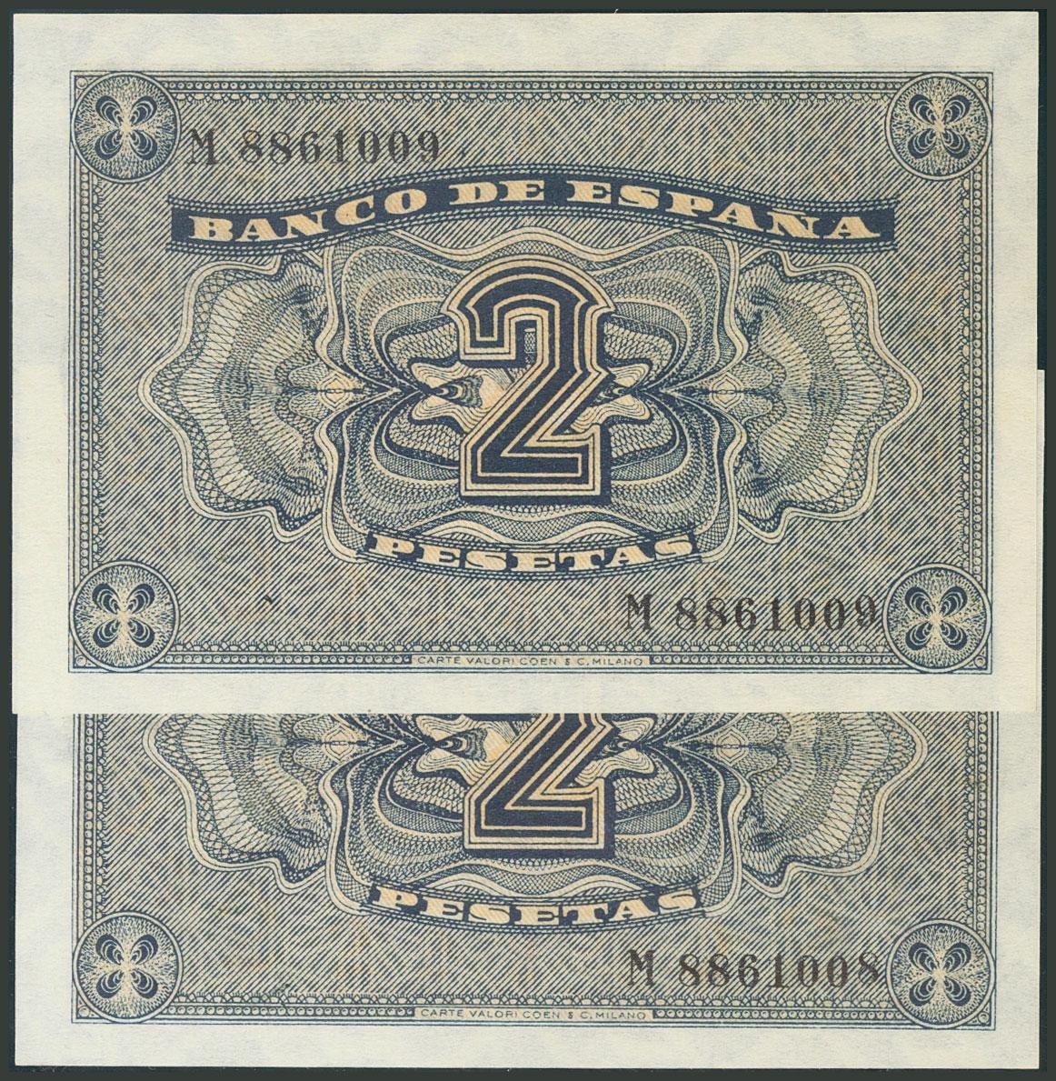 2 Pesetas. 30 de Abril de 1938. Pareja correlativa. Serie M. (Edifil 2017: 429a). SC.