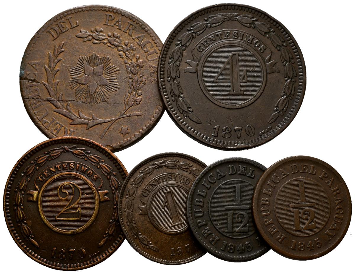 PARAGUAY. Interesante lote compuesto por 6 monedas de cobre de los valores de 1/12 Reales de 1845 y 1, 2 y 4 Centésimos de 1870. Diferentes estados de conservación. A EXAMINAR.