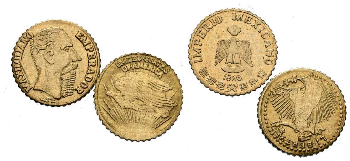 MONEDAS EXTRANJERAS. Conjunto de 2 piezas de joyería en oro galvanizado de Maximiliano (1865) y del doble águila norteamericano. A EXAMINAR.