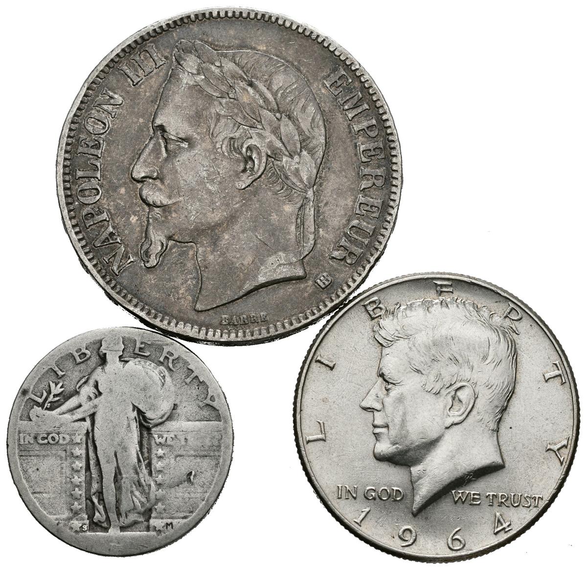 MONEDAS EXTRANJERAS. Conjunto de 3 monedas de plata de los Estados Unidos de América y Francia. Diferentes estados de conservación. A EXAMINAR.