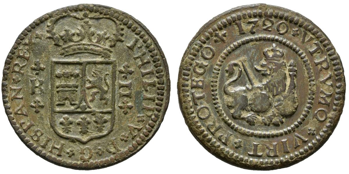 FELIPE V (1700-1746). 2 Maravedís. (Ae. 4,37g/24mm). 1720. Barcelona. (Cal-54). MBC+.