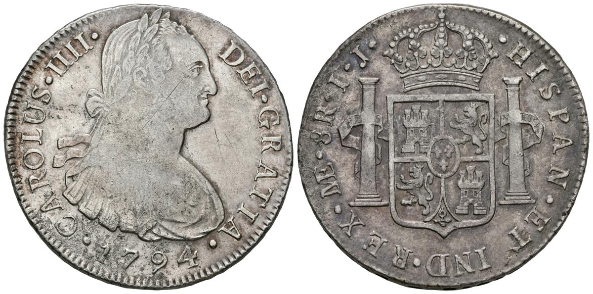 CARLOS IV. 8 Reales. 1794. Lima IJ. Cal-648. Ar. 26,84g. Rayitas en anverso. Bonita pátina en reverso. MBC/MBC+.