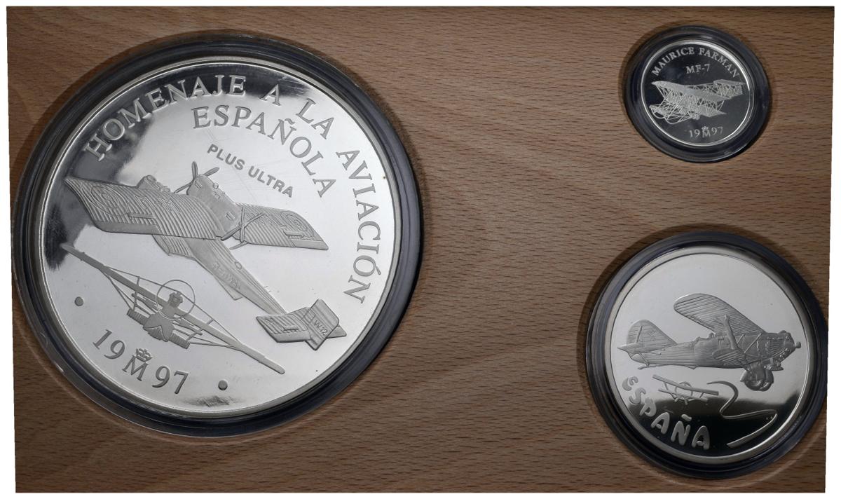 JUAN CARLOS I. Serie completa con los valores 1, 5 y 25 Euros. 1997. "HOMENAJE A LA AVIACION ESPAÑOLA". PROOF. Todas presentadas en estuche oficial con certificado.