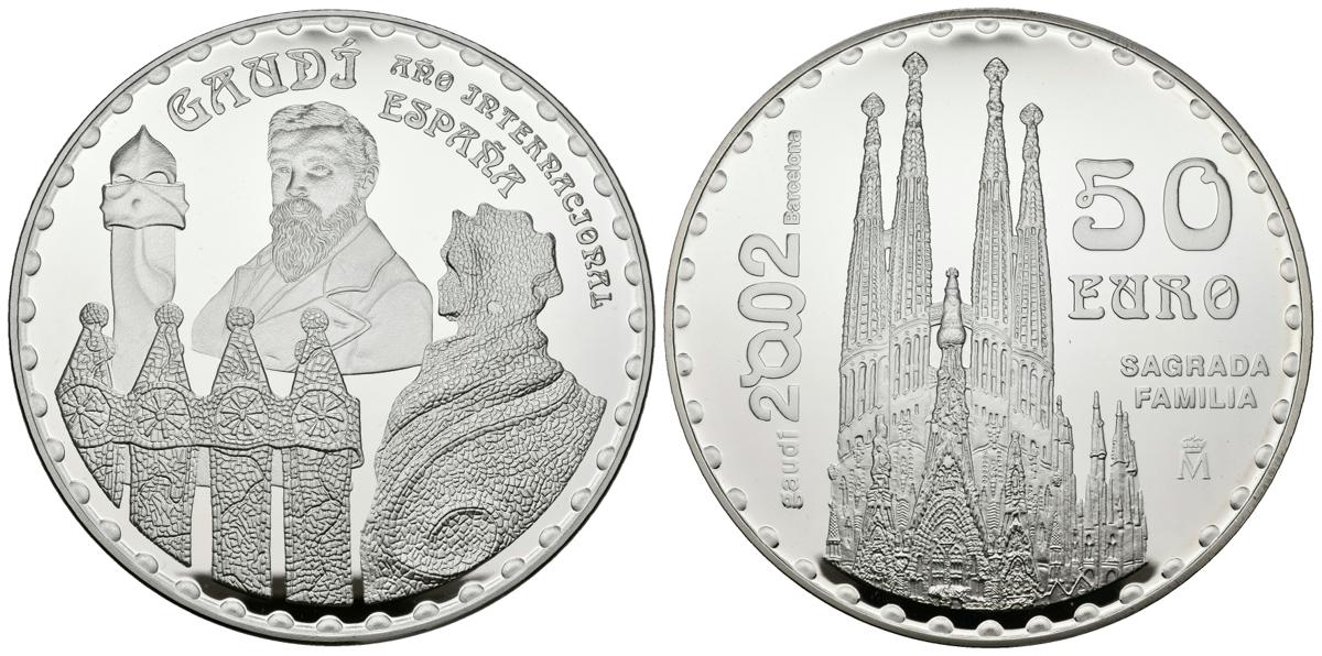 JUAN CARLOS I. 50 Euros. (Ar. 168,75g/73mm). 2002. "SAGRADA FAMILIA". PROOF. Presentada en estuche oficial y certificado.