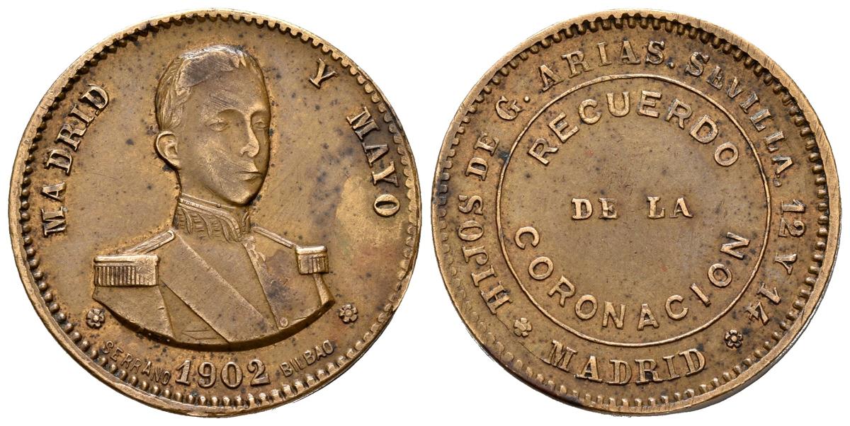 MEDALLA. Coronación del rey Alfonso XIII (Recuerdo por Hijos de G. Arias). Firmada por Serrano Bilbao. 1902. (La. 4,71g/24mm). MBC.