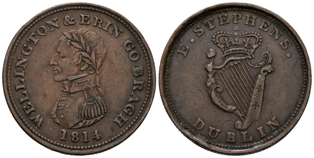 IRLANDA. Medalla o token con valor de 1 Penny. (Cu. 15,09/34mm). 1814. Pieza acuñada por Edward Stephens en la ceca privada de Dublín. MBC+. Golpe en el canto. Rara.