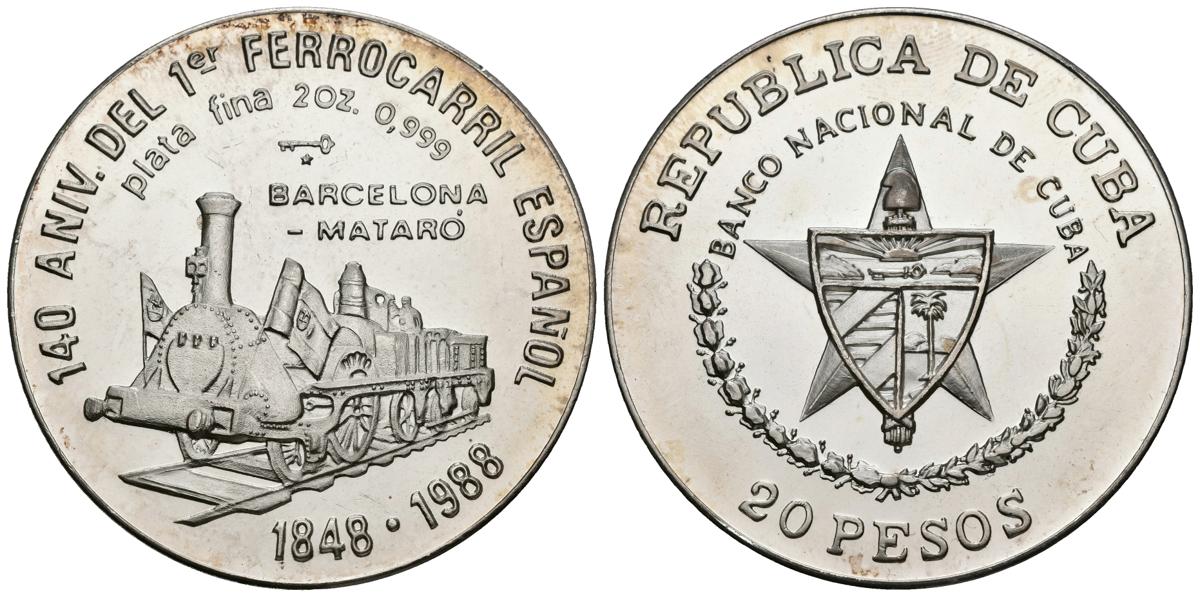 CUBA. 20 Pesos. (Ar. 62,20g/45mm). 1988. "140º Aniversario del 1º ferrocarril español (Barcelona-Mataró)". PROOF.