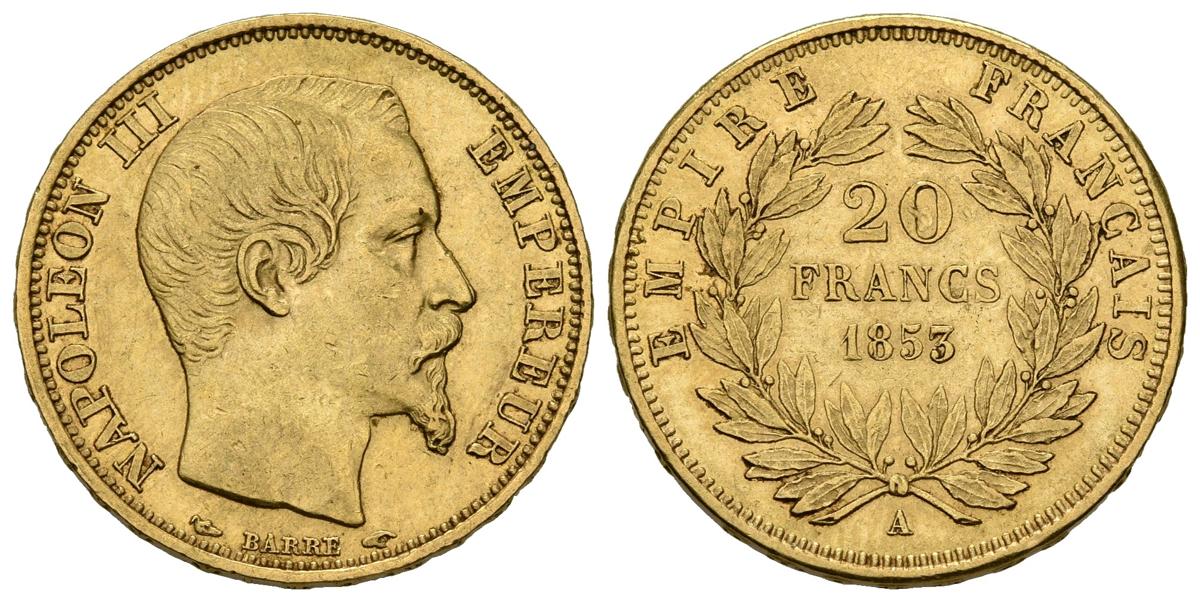 FRANCIA. 20 Francos. (Au. 6,44g/21mm). 1853 A. (Km#781.1). EBC-.
