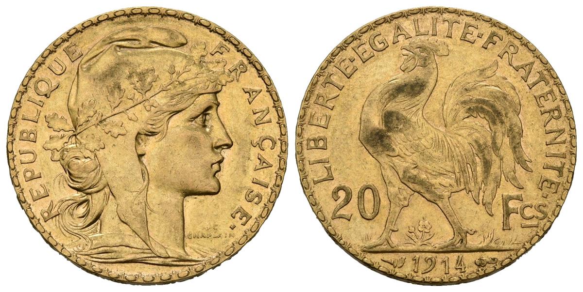 FRANCIA. 20 Francs. (Au. 6,45g/21mm). 1914. (Km#857). MBC+.