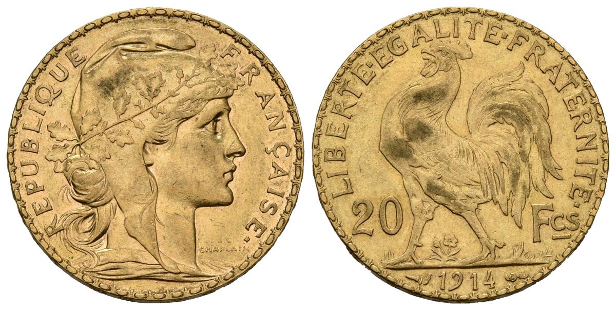 FRANCIA. 20 Francs. (Au. 6,45g/21mm). 1914. (Km#857). MBC+.