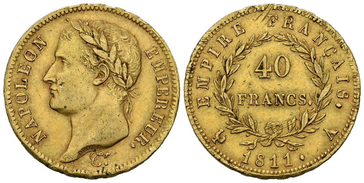 FRANCIA. 40 Francos. (Au. 12,91g/26mm). 1811. París A. (Km#696.1). MBC+/MBC. Rayas en reverso.