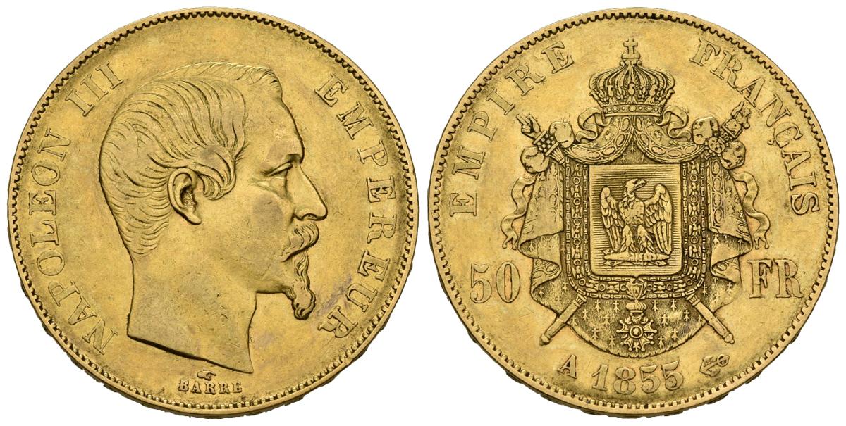 FRANCIA. 50 Francs. (Au. 16,08g/28mm). 1855. París A. (Km#785.1). MBC.