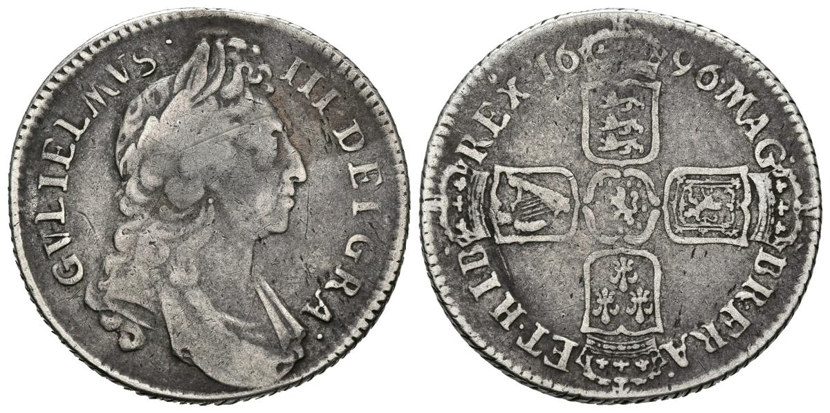 GRAN BRETAÑA. 1 Shilling. (Ar. 5,87g/25mm). 1696. (Km#485.1). Primer busto William III. MBC-.