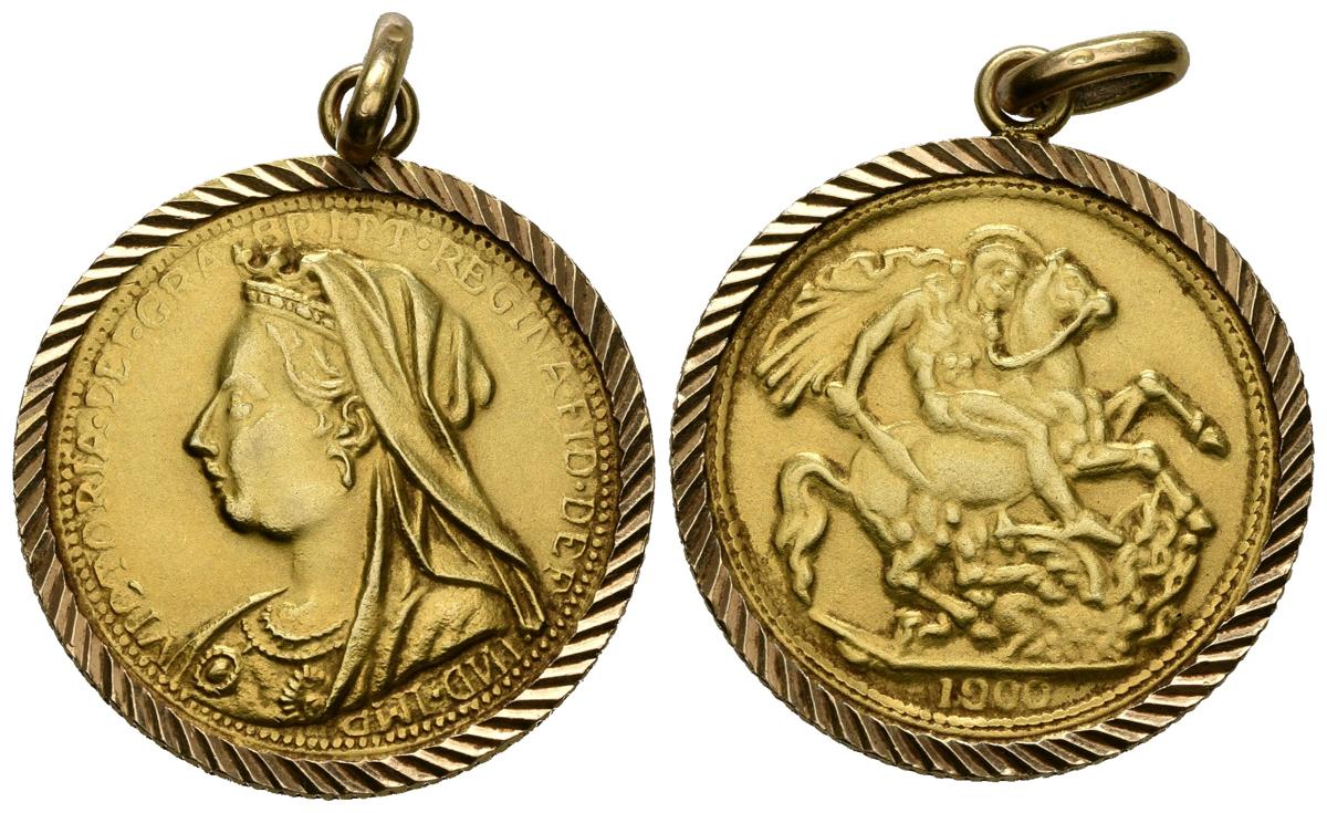 GRAN BRETAÑA.1 Soberano (Au. 5,44g/24mm). 1900. (Km#785). MBC. Reproducción de joyería. Engarzada en aro.