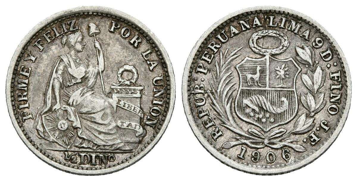 PERU. 1/2 Dinero (Ar. 1.24g/15.1mm).1906/1895 (sobrefecha). Lima. (Km#206.2). MBC.