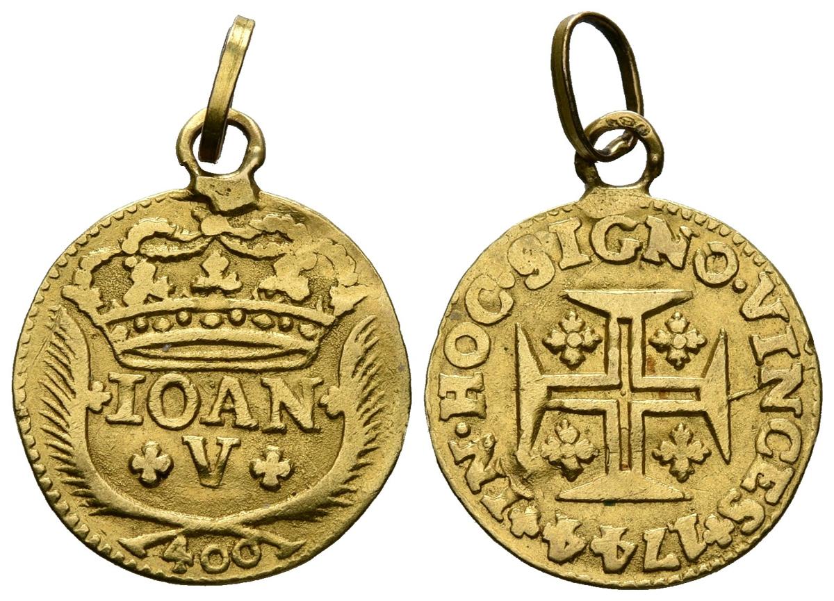 PORTUGAL. 1 Cruzado (400 Reis) (Au, 1g/14mm). 1744. (Fr.100; Gomes 84.15). MBC. Engarzado como joya.