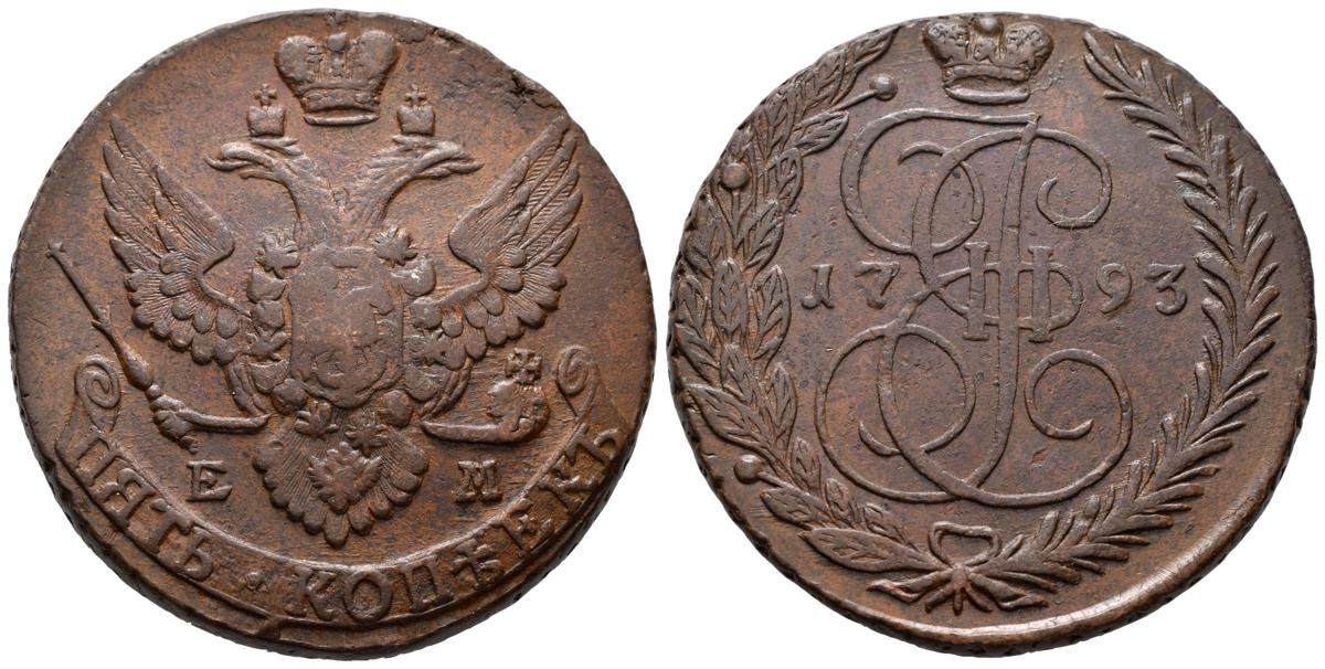 RUSIA. Catherina II. 5 Kopeks. 1793. Ekaterinburgo EM. Km#C59.3; Bitkin 647. Ae. 55,30g. MBC+.