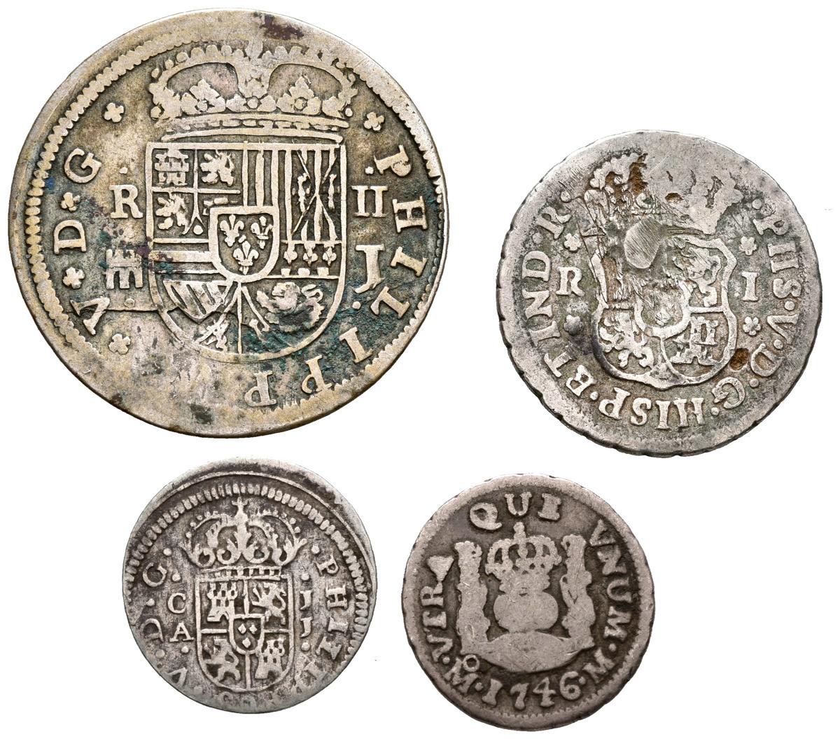 MONARQUIA ESPAÑOLA. Lote de 4 monedas de Felipe V. Diferentes módulos incluyendo 1/2 Real Columnario de México. Diferentes estados de conservación. A EXAMINAR.