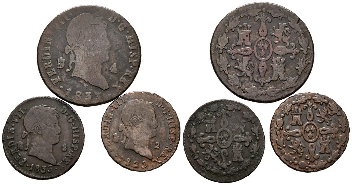 MONARQUIA ESPAÑOLA. Conjunto de 3 monedas de cobre de Fernando VII. Valores de 2 y 4 maravedís. Ceca de Segovia. Dos de ellas de 1833, último año de su reinado. Calidades diversas. A EXAMINAR.