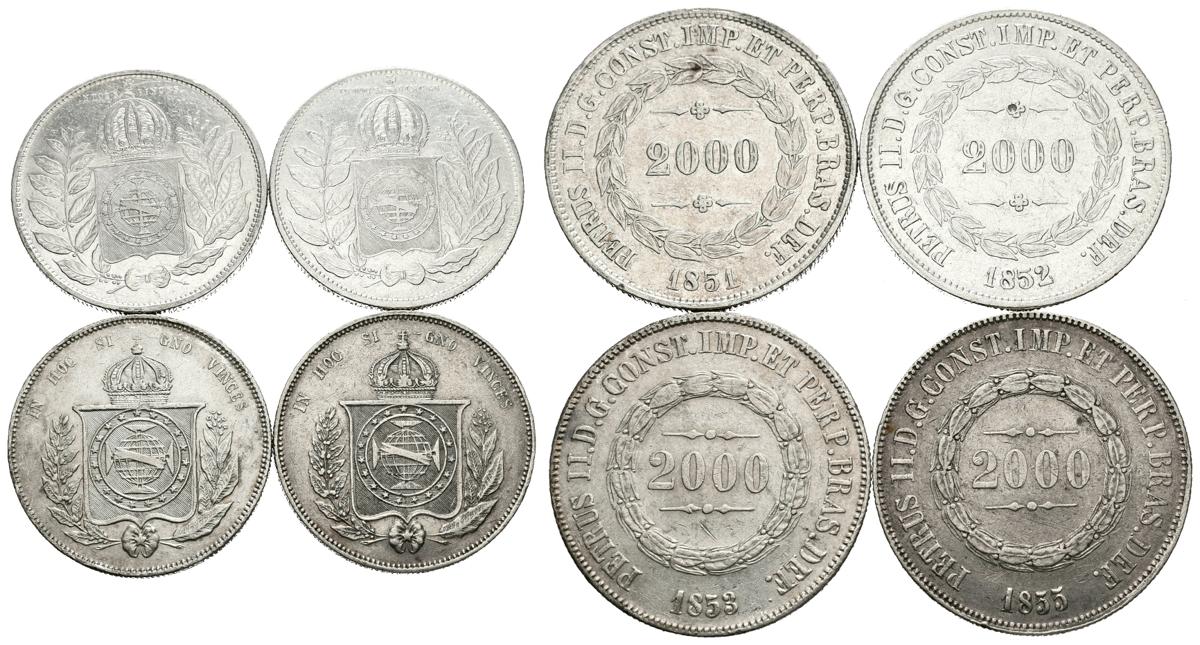 BRASIL. Lote compuesto por 4 monedas de 2000 Reis de los años 1851, 1852, 1853 y 1855. Ar. MBC+/EBC-. A EXAMINAR.
