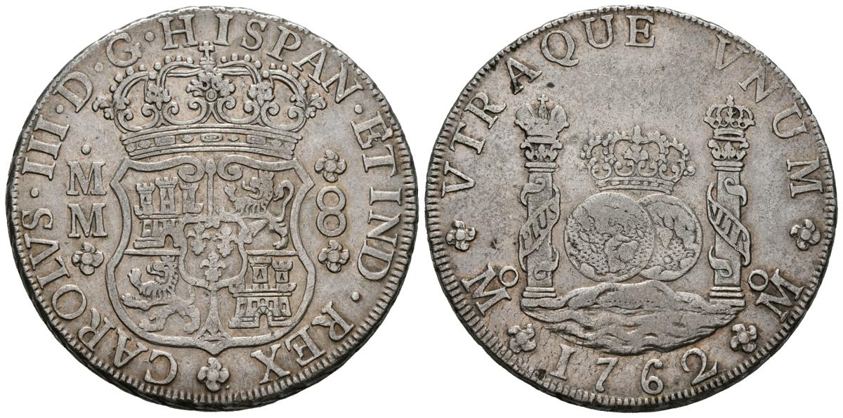 CARLOS III (1759-1788). 8 Reales. (Ar. 26,88g/39mm). 1762. México MM. (Cal-2019-1080). Variante: Cruz entre H e I. MBC+.