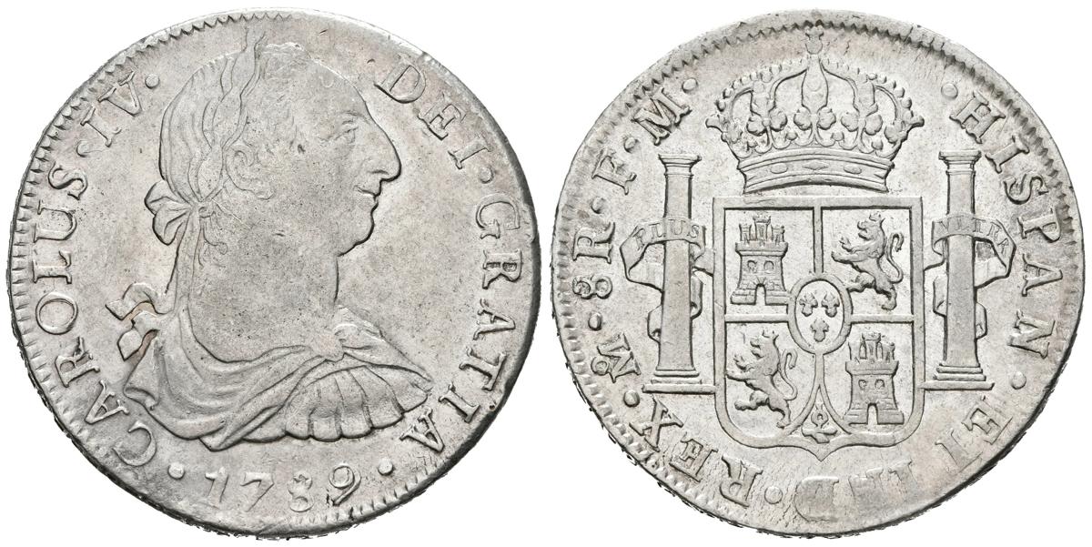 CARLOS IV (1788-1808). 8 Reales. (Ar. 26,92g/39mm). 1789. México FM. (Cal-2019-950). Busto de Carlos III y ordinal IV. MBC+.