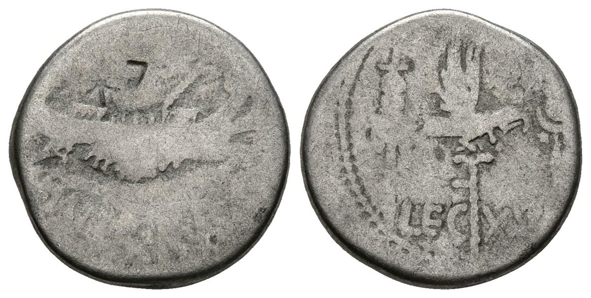 MARCO ANTONIO. Denario. (Ar. 3,46g/17mm). 32-31 a.C. Ceca volante. (Crawford 544/36; FFC 59). BC. Contramarca en anverso.