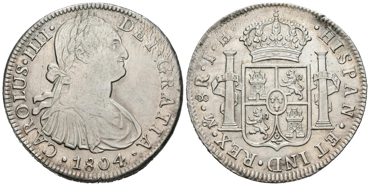 CARLOS IV (1788-1808). 8 Reales. (Ar. 26,83g/40mm). 1804. México TH. (Cal-2019-980). EBC-/MBC+. Plata agria y rayitas.