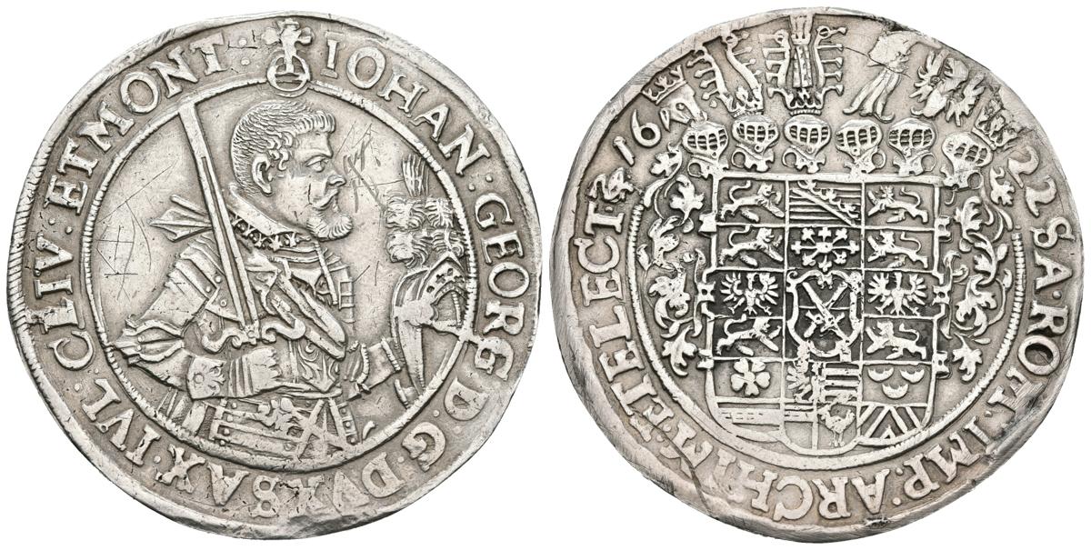 ALEMANIA. Thaler. (Ar. 27,90g/43mm). 1622. Sajonia. (KM#132). Johan Gerog I. EBC-. Rayitas en anverso. Rara.