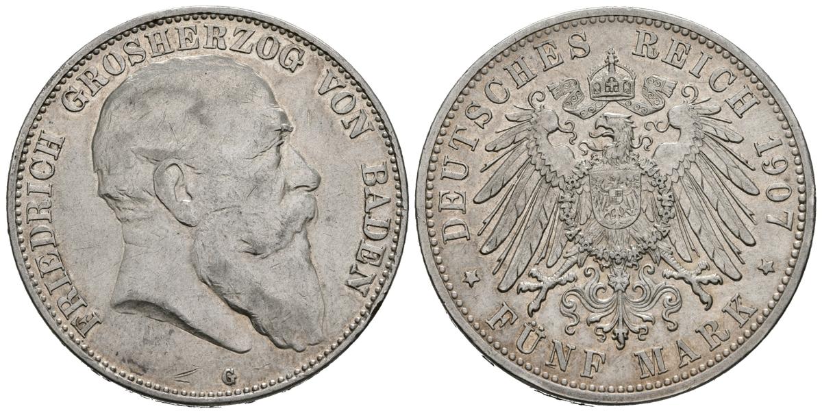 ALEMANIA. 5 Marcos (Ar. 27,83g/38mm). 1907. Baden. (Km#274). MBC/MBC+