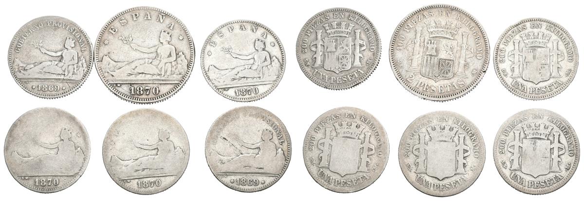 CENTENARIO DE LA PESETA. Conjunto de 6 monedas de 1 y 2 pesetas del Gobierno Provisional. Incluye dos piezas de 1 peseta con el lema Gobierno Provisional. Diferentes estados de conservación. A EXAMINAR.