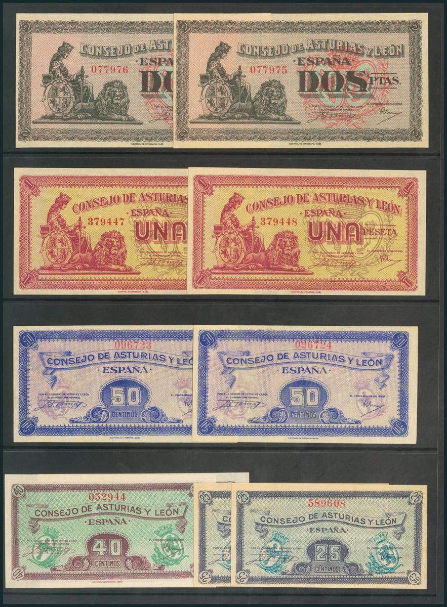 Conjunto de toda la serie de Asturias y León, seis valores emitidos en 1937, todos ellos en parejas correlativas. (Edifil 2017: 394/98). Extraordinariamente raro conjunto. SC-.