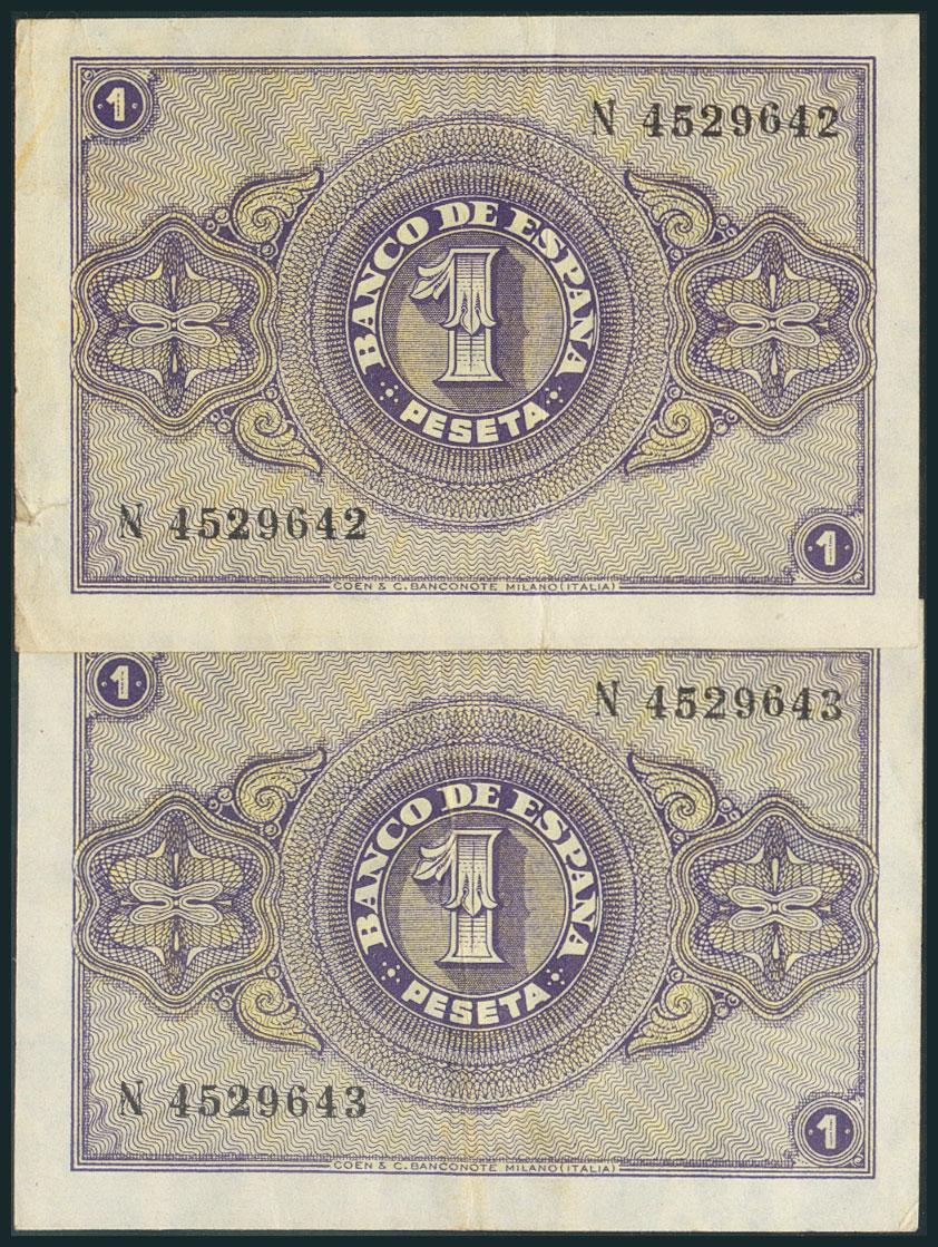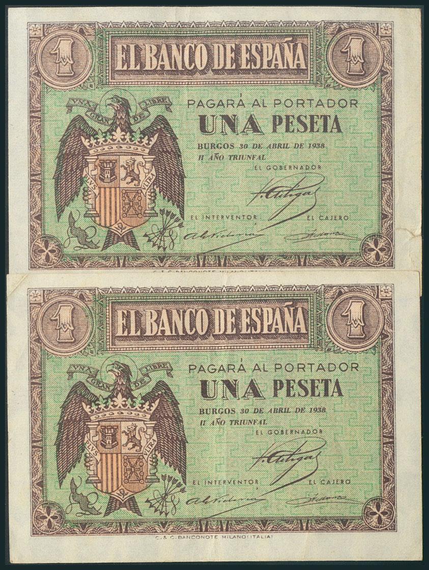 1 Peseta. 30 de Abril de 1938. Pareja correlativa. Serie N, última serie emitida. (Edifil 2017: 428b). Raro. RC/MBC.