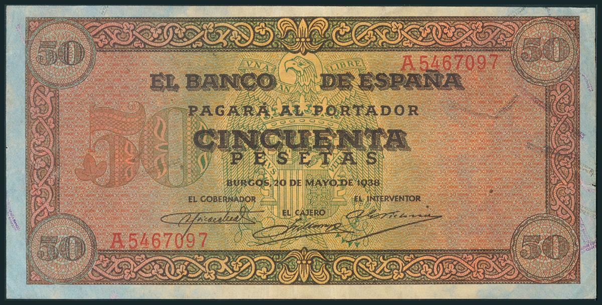 50 Pesetas. 20 de Mayo de 1938. Serie A. (Edifil 2017: 431). Conserva buena parte del apresto original. MBC+.