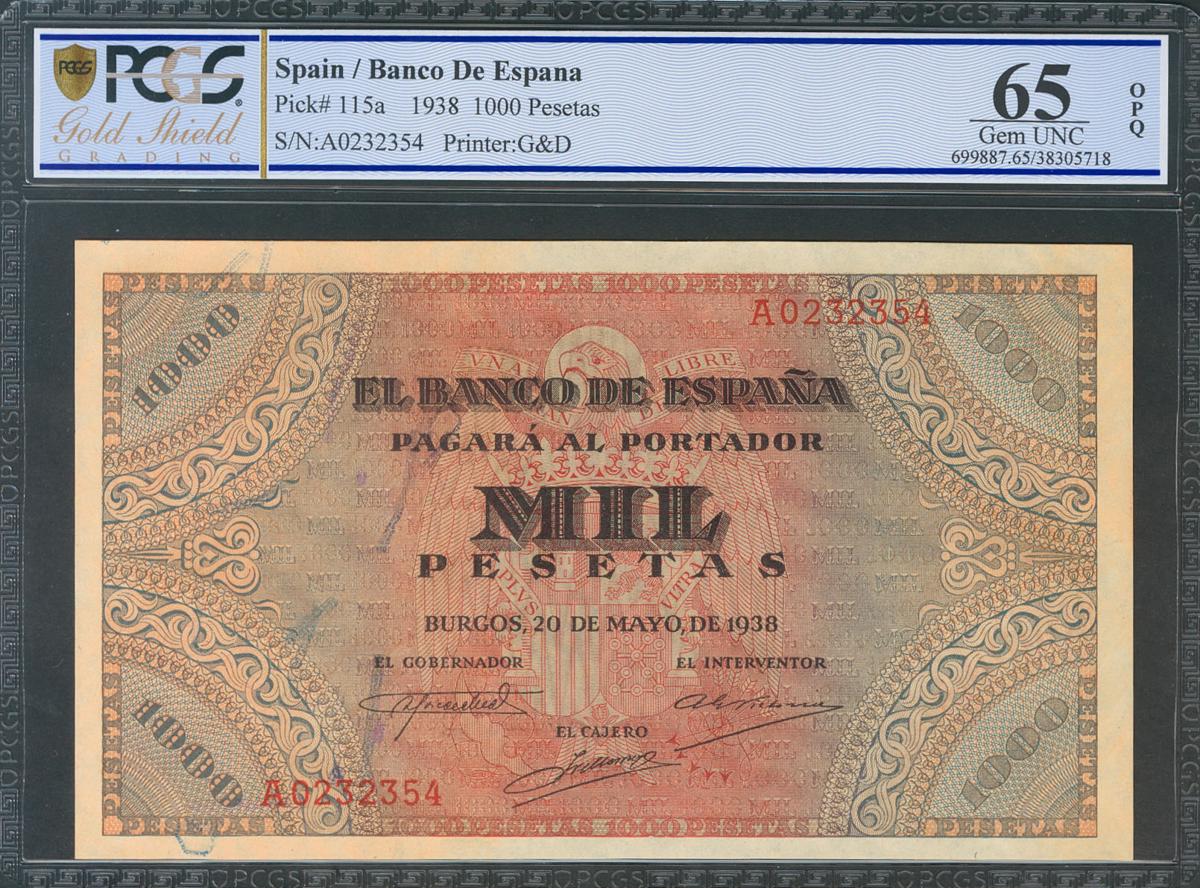 1000 Pesetas. 20 de Mayo de 1938. Serie A. (Edifil 2017: 434). Apresto original. Encapsulado PCGS 65OPQ. SC. (para hacerse una idea de la rareza del billete en esta calidad, PCGS otorga a día 1 de Julio de 2020 la máxima calidad a este billete)
