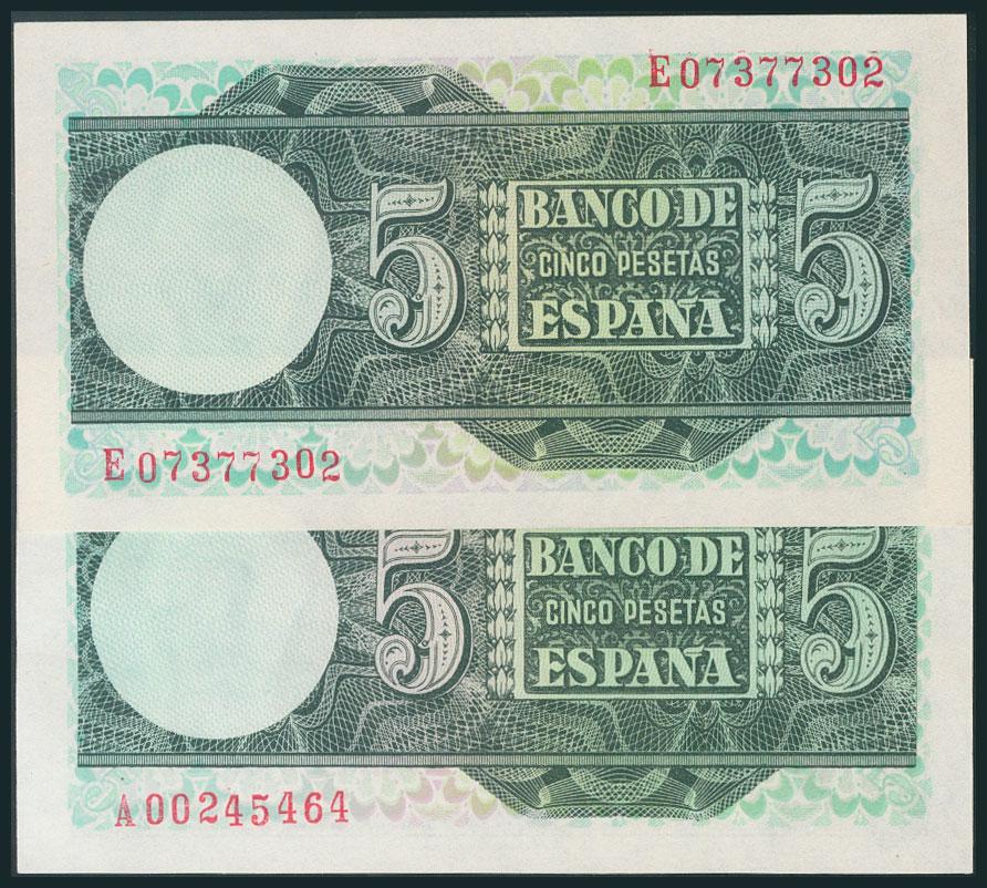 Conjunto de 2 billetes de 5 Pesetas emitido el 5 de Marzo de 1948 con las series A y E, respectivamente (Edifil 2017: 455a). SC.