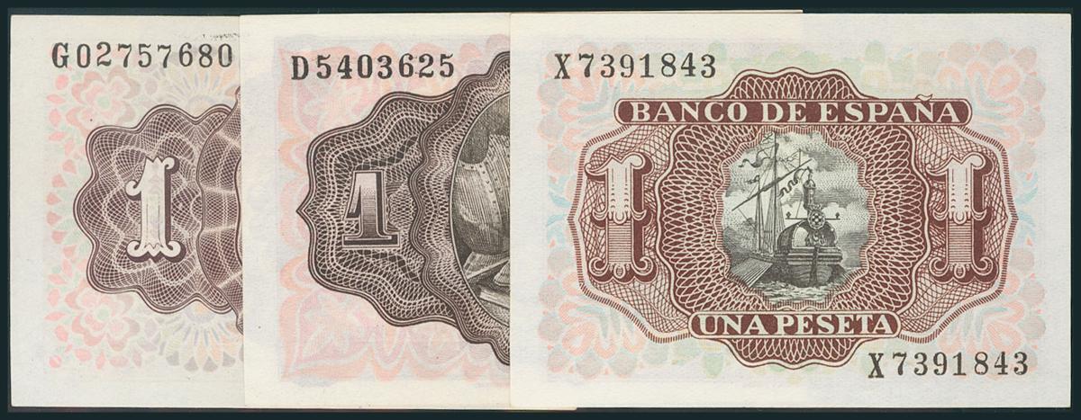 Conjunto de 3 billetes de 1 Peseta emitidos el 19 de Junio de 1948, 19 de Noviembre de 1951 y 22 de Julio de 1953 con las series G, D y X, respectivamente (Edifil 2017: 457a, 461a y 465a). SC/SC-.