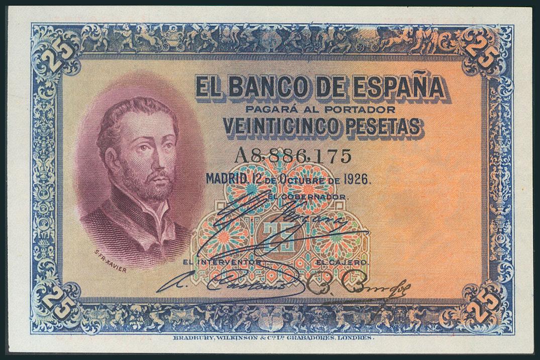 25 Pesetas. 12 de Octubre de 1926. Serie A. (Edifil 2017: 325a). Apresto original. Raro así. EBC+.