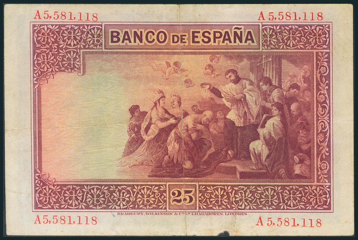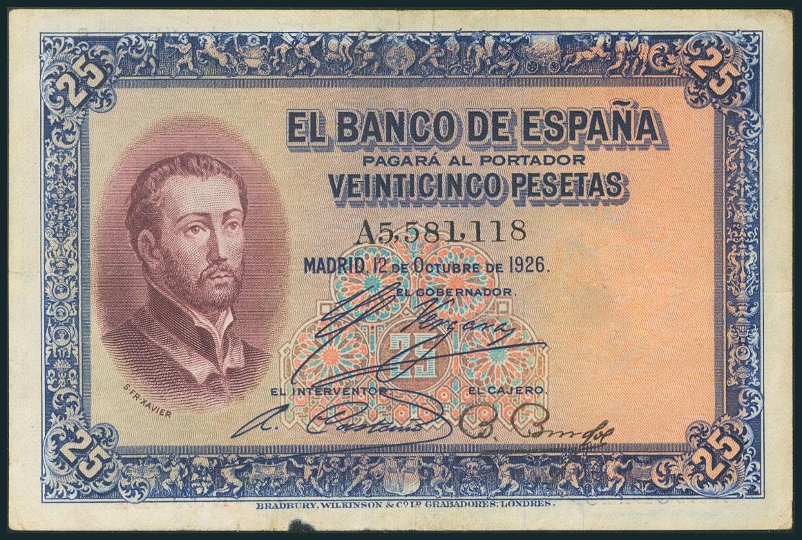 25 Pesetas. 12 de Octubre de 1926. Serie A. (Edifil 2017: 325a). Falta en el margen inferior. RC.