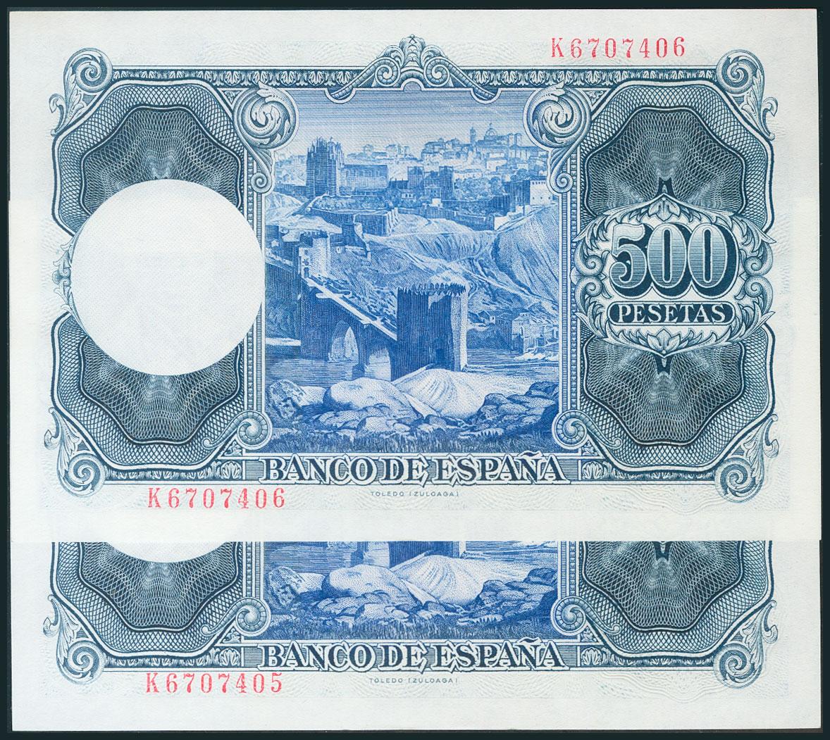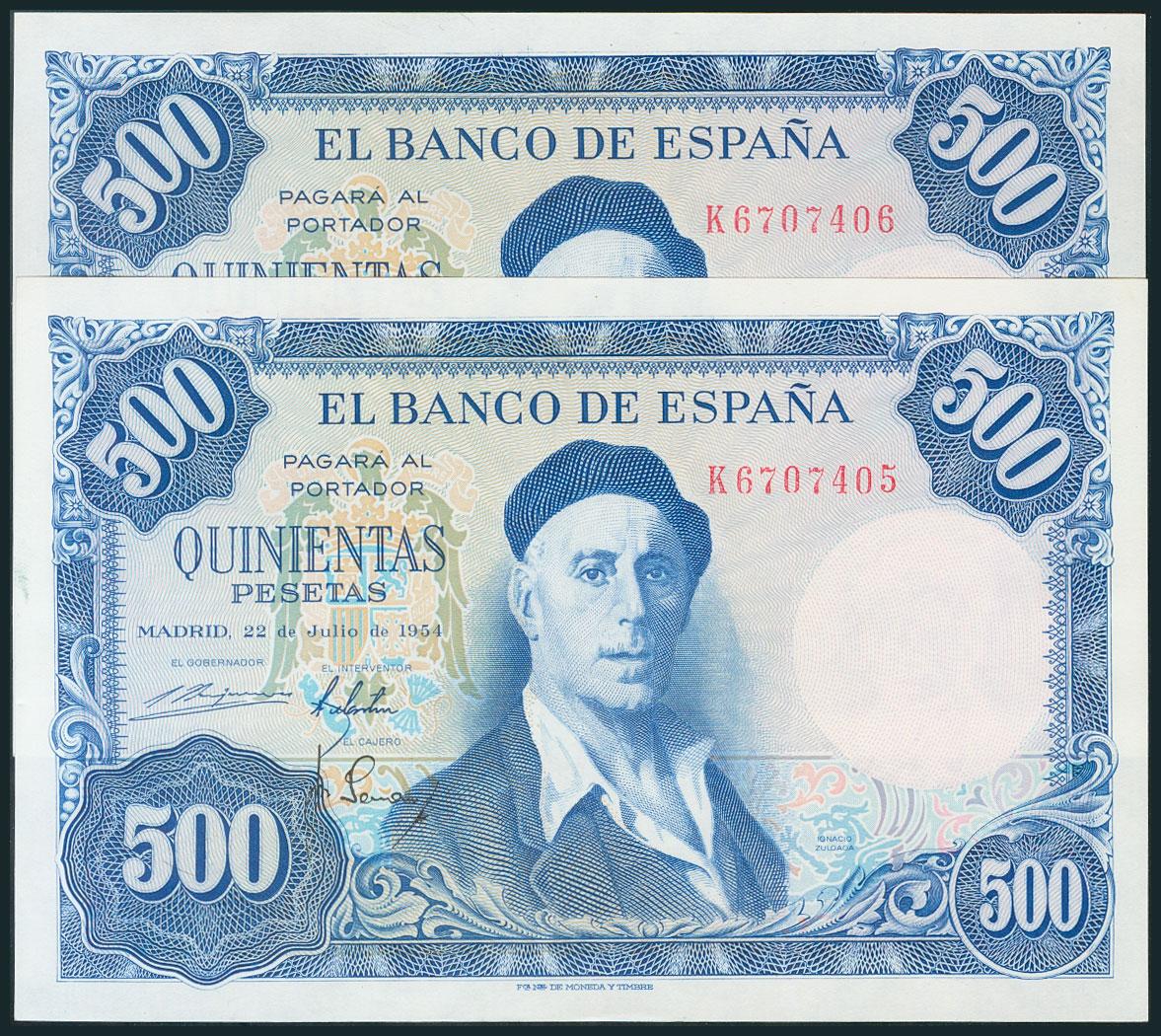 500 Pesetas. 22 de Julio de 1954. Pareja correlativa. Serie K. (Edifil 2017: 468b). Apresto original. SC.