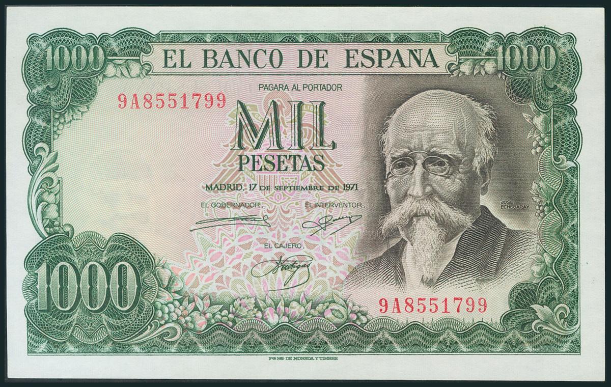 1000 Pesetas. 17 de Septiembre de 1971. Serie 9A. (Edifil 2017: 474d). Apresto original. SC.