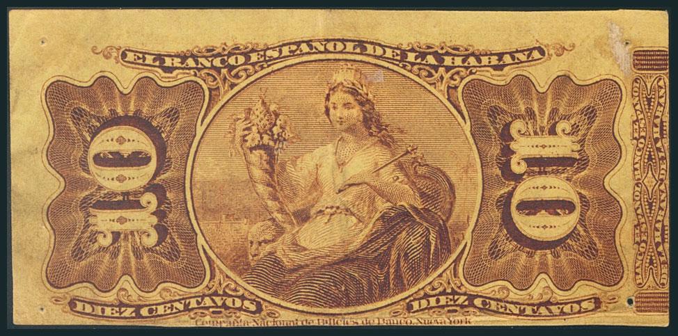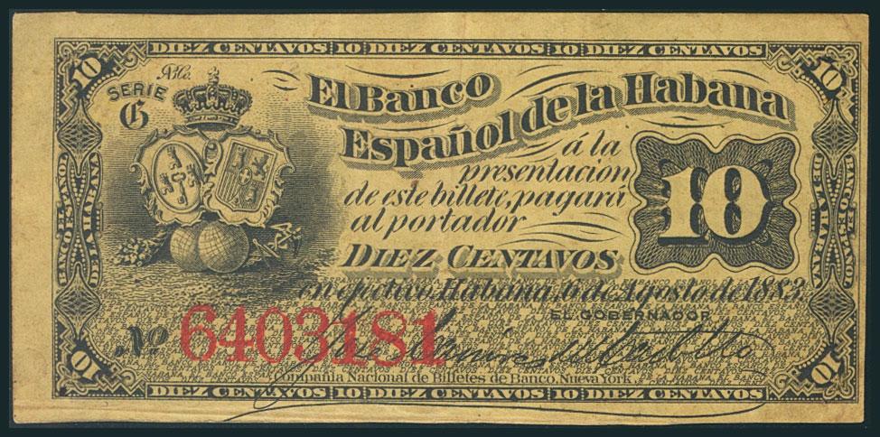 CUBA. 10 Pesetas. 6 de Agosto de 1883. (Edifil 2017: 46). MBC. (se trata del billete fotografiado en el catálogo especializado de Edifil)