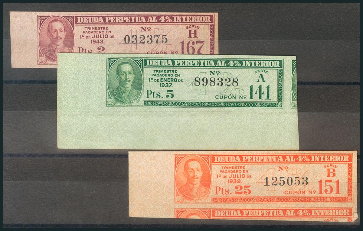 Conjunto de 3 billetes de "Deuda Perpetua" de 2 Pesetas, 5 Pesetas y 25 Pesetas, emitidos el 1 de Julio de 1939 y con las series H, A y B, respectivamente. EBC.