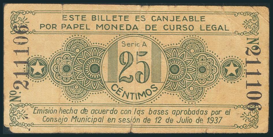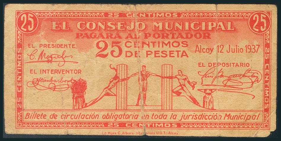 ALCOY. 25 Céntimos. 12 de Julio de 1937. (González: 377). BC.