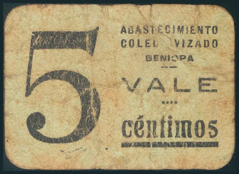 BENIOPA (VALENCIA). 5 Céntimos. (1937ca). (Gónzález: 1147). Raro. RC. (coincide con el fotografiado en la obra de Rafael González Hidalgo).
