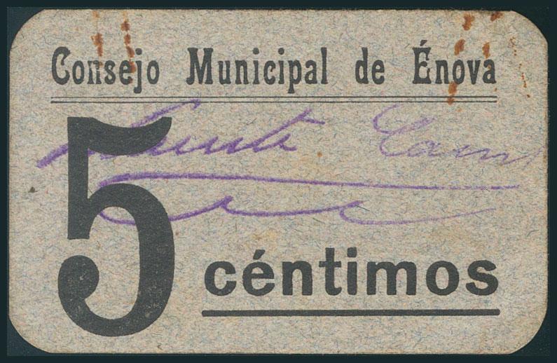 ENOVA (VALENCIA). 5 Céntimos. (1938ca). (González: 2304). Muy raro. EBC. (coincide con el fotografiado en la obra de Rafael González Hidalgo).
